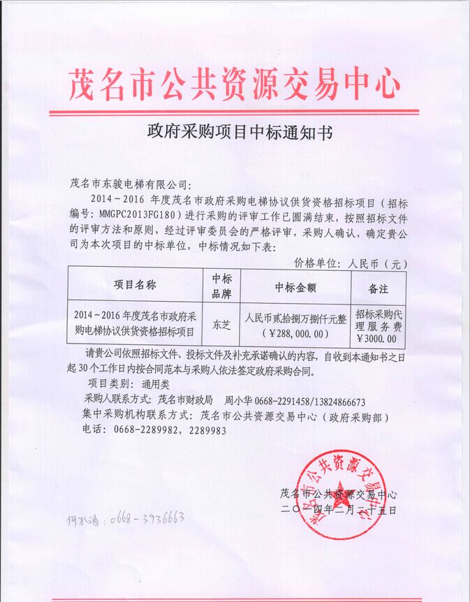 | 祝賀茂名市東駿電梯有限公司中標茂名市財政局電梯設(shè)備采購招標項目 |